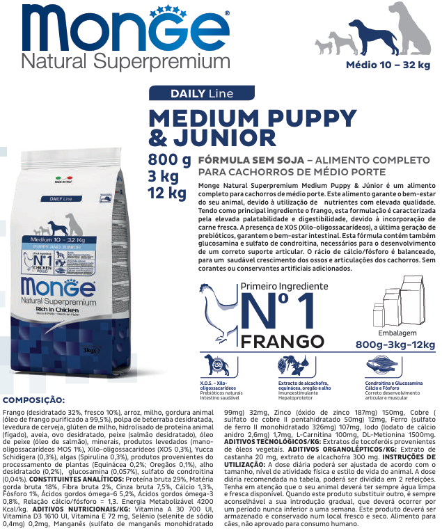 Monge Medium Puppy & Junior de Frango 800g: Alimento completo para cachorros de médio porte, sem soja.