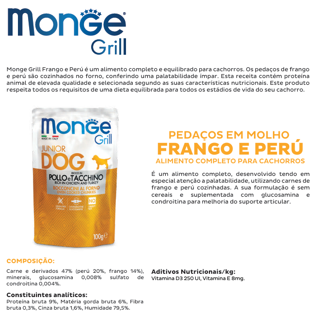 Monge Grill Puppy & Junior de Frango e Perú 100g: Pedaços de frango e perú em molho.