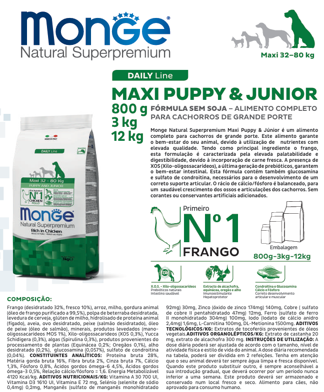 Monge Maxi Puppy & Junior de Frango 800g: Alimento completo para cachorros de grande porte, sem soja.