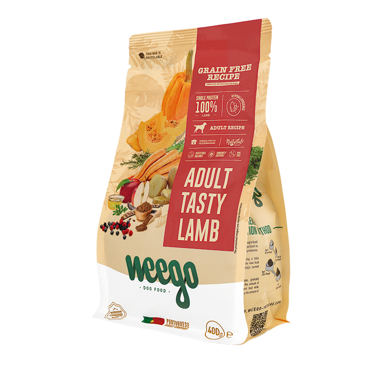 Weego® Adult Tasty Lamb é um alimento seco, natural, completo e equilibrado à base de borrego, sem cereais e adaptado para cães adultos de qualquer raça ou tamanho.