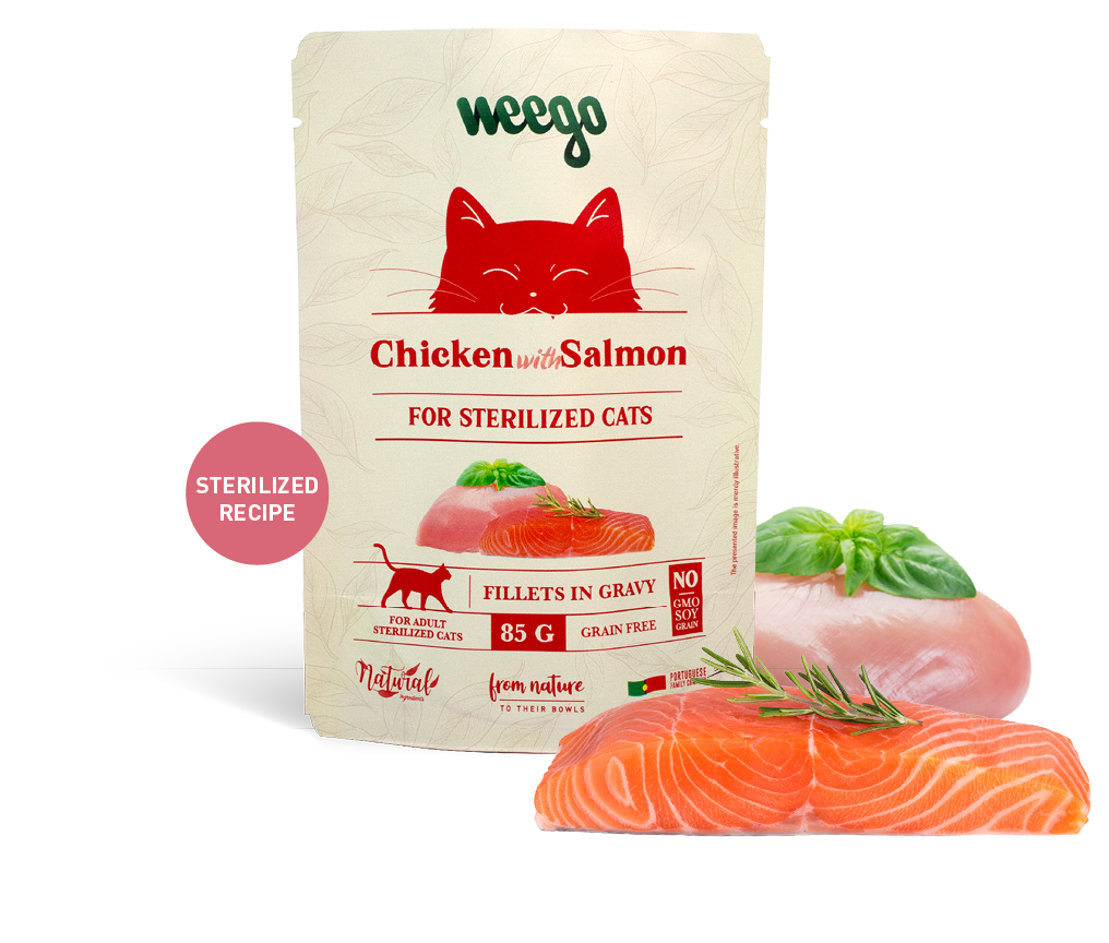 Weego® Chicken with Salmon é um alimento húmido completo, sem cereais, para gatos adultos. A sua textura consiste em pequenos filetes com molho que irão deliciar o teu gato.