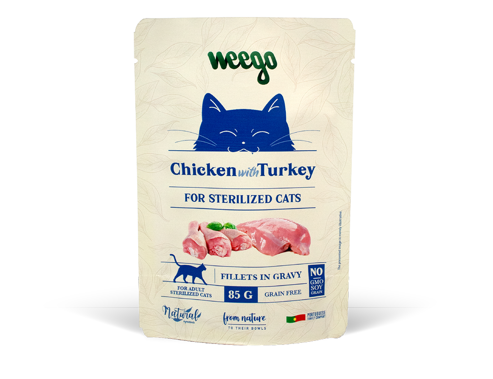 Weego® Chicken with Turkey é um alimento húmido completo, sem cereais, para gatos adultos. A sua textura consiste em pequenos filetes com molho que irão deliciar o teu gato.